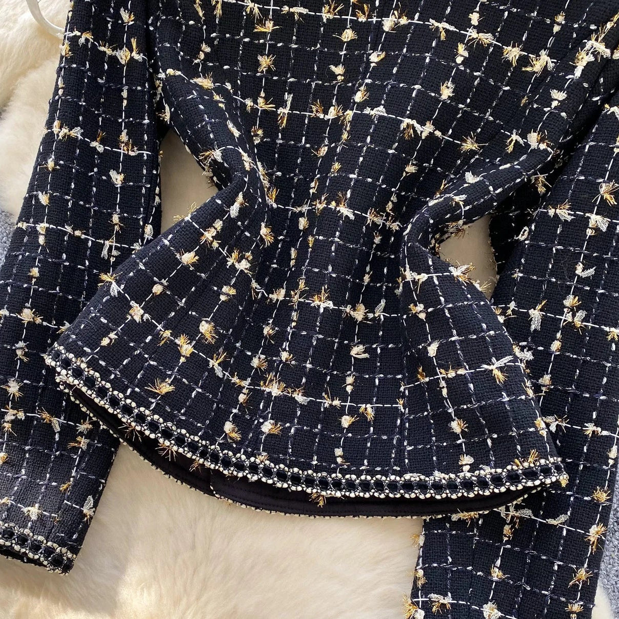 The Jacket: Features a classic navy and gold checkered weave with a flattering peplum silhouette that cinches the waist. The ornate bow detail at the neckline, accented with a center crystal, adds a touch of Parisian flair, while the braided trim provides a high-end, finished look.