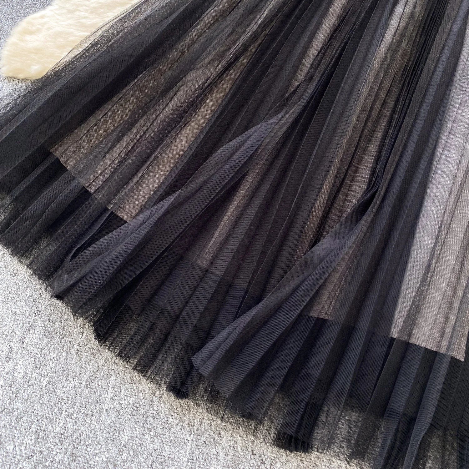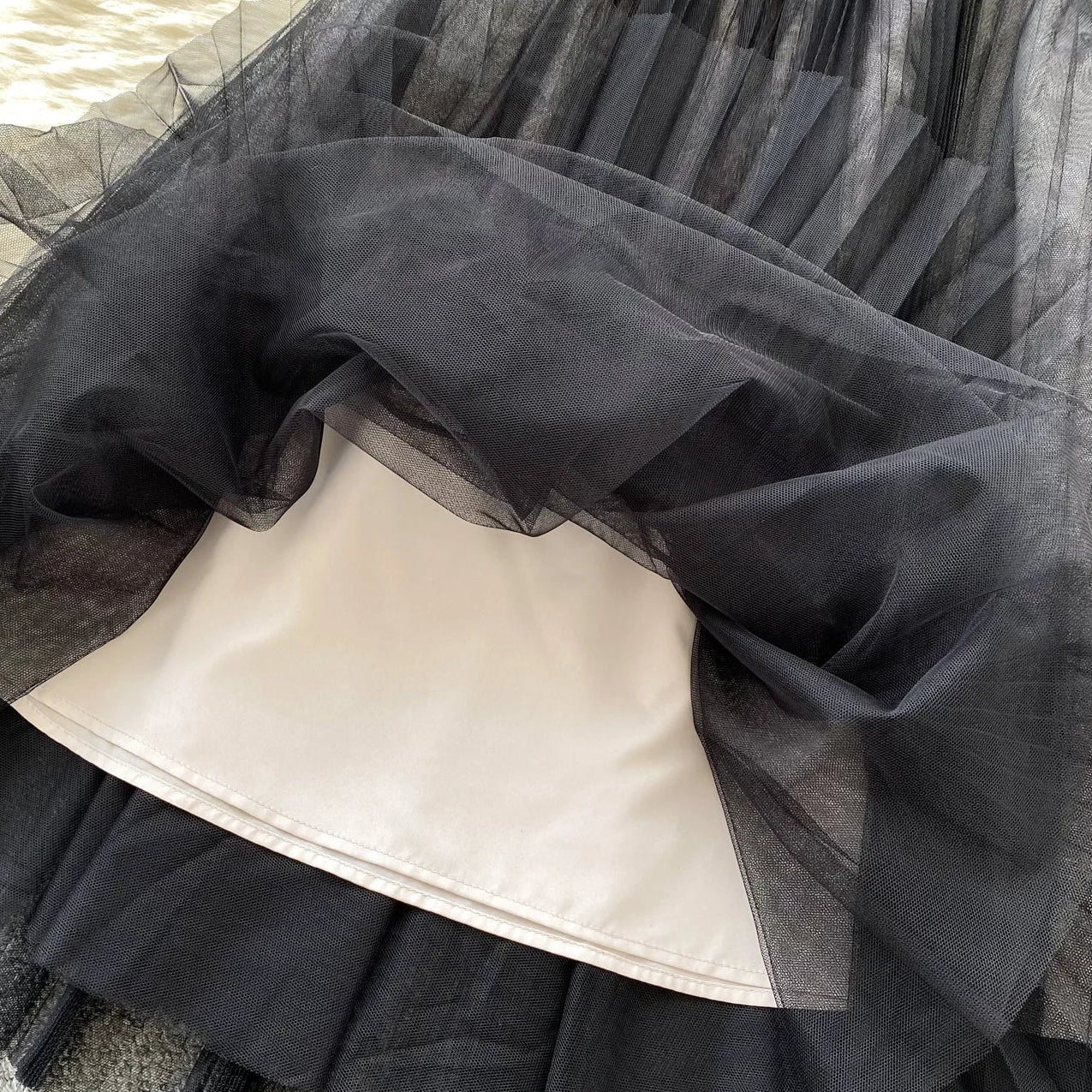 The Skirt: A dreamy, 85cm length pleated tulle skirt. Designed with a comfortable elasticated high-waist and layered mesh for volume without the weight. The slightly shorter inner lining creates a beautiful sheer effect at the hemline.