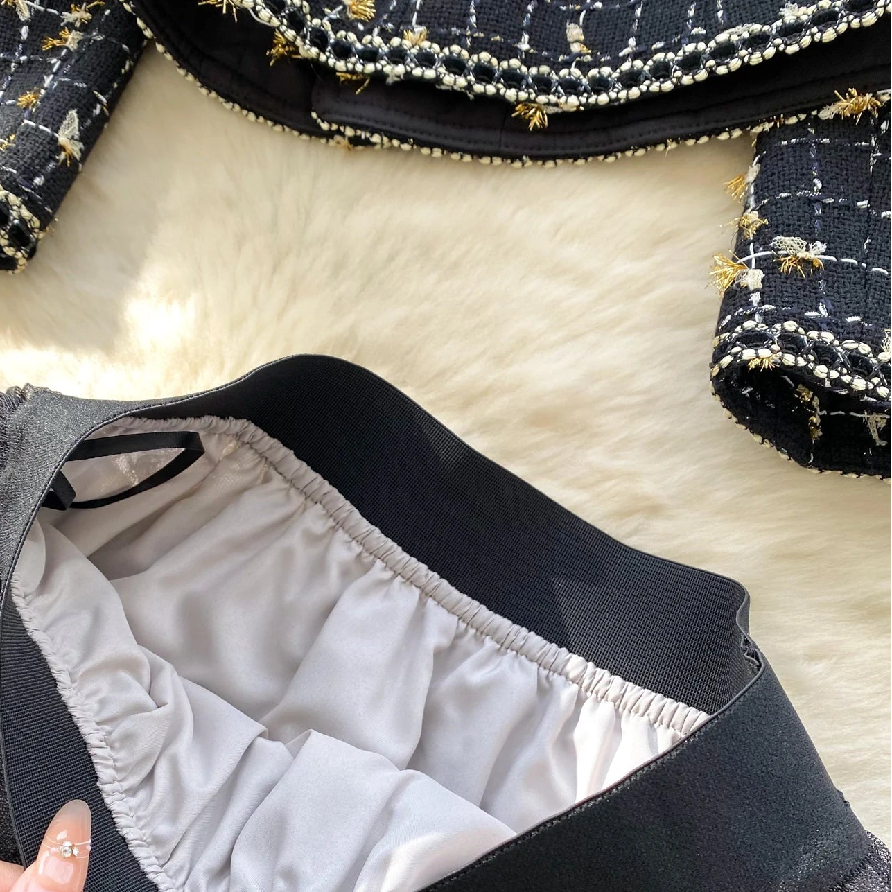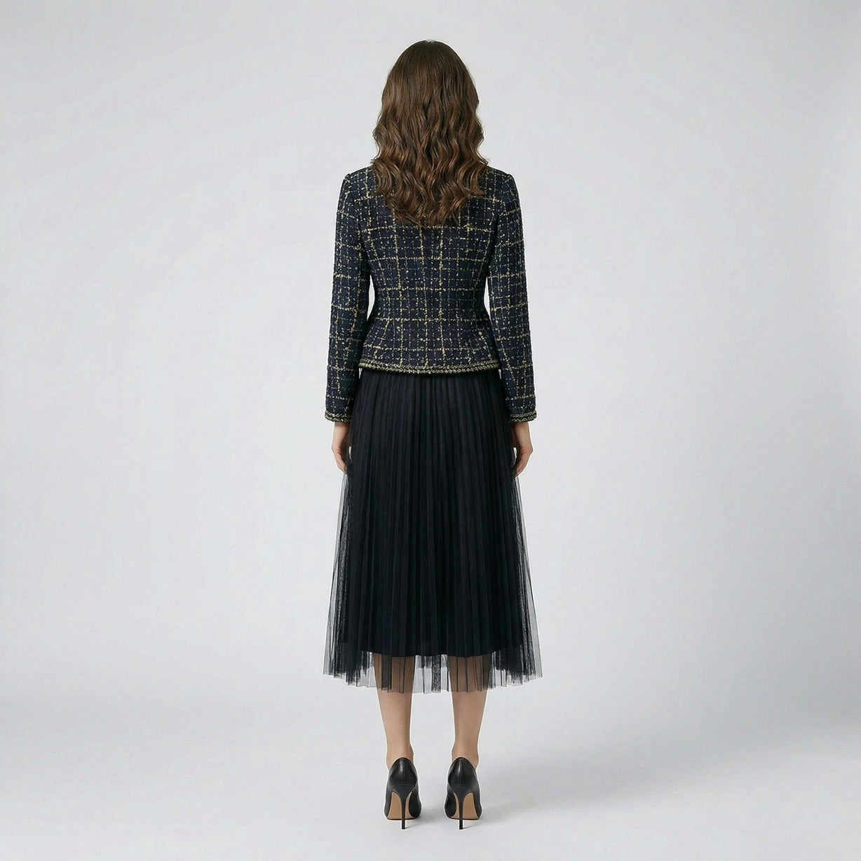Step into timeless elegance with the ANA Two-Piece Set. This curated ensemble combines the sophisticated texture of a vintage-inspired tweed jacket with the soft, romantic movement of a pleated tulle skirt. Perfect for formal luncheons, gallery openings, or making a statement at your next special event.