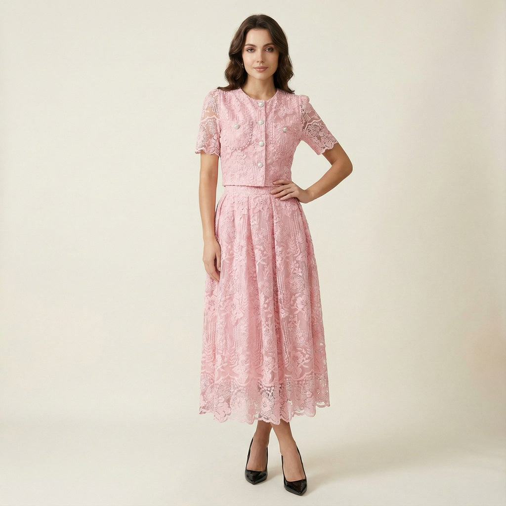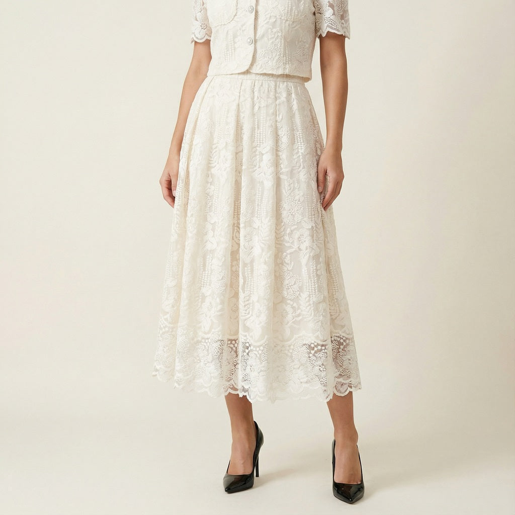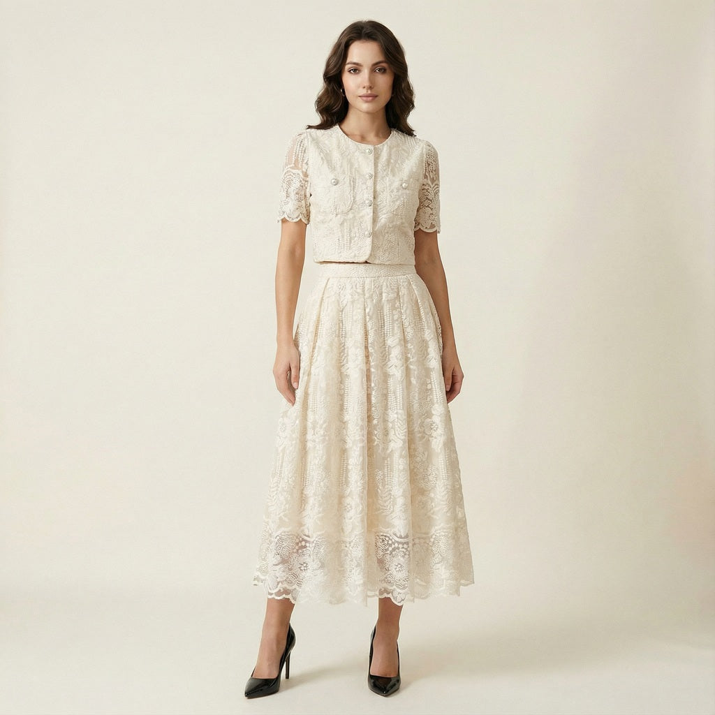 This coordinated set features a short-sleeved lace top detailed with delicate floral embroidery and vintage-inspired pearl buttons. The matching high-waisted midi skirt offers a graceful flow, finished with a scalloped lace hemline that adds a touch of romantic flair.