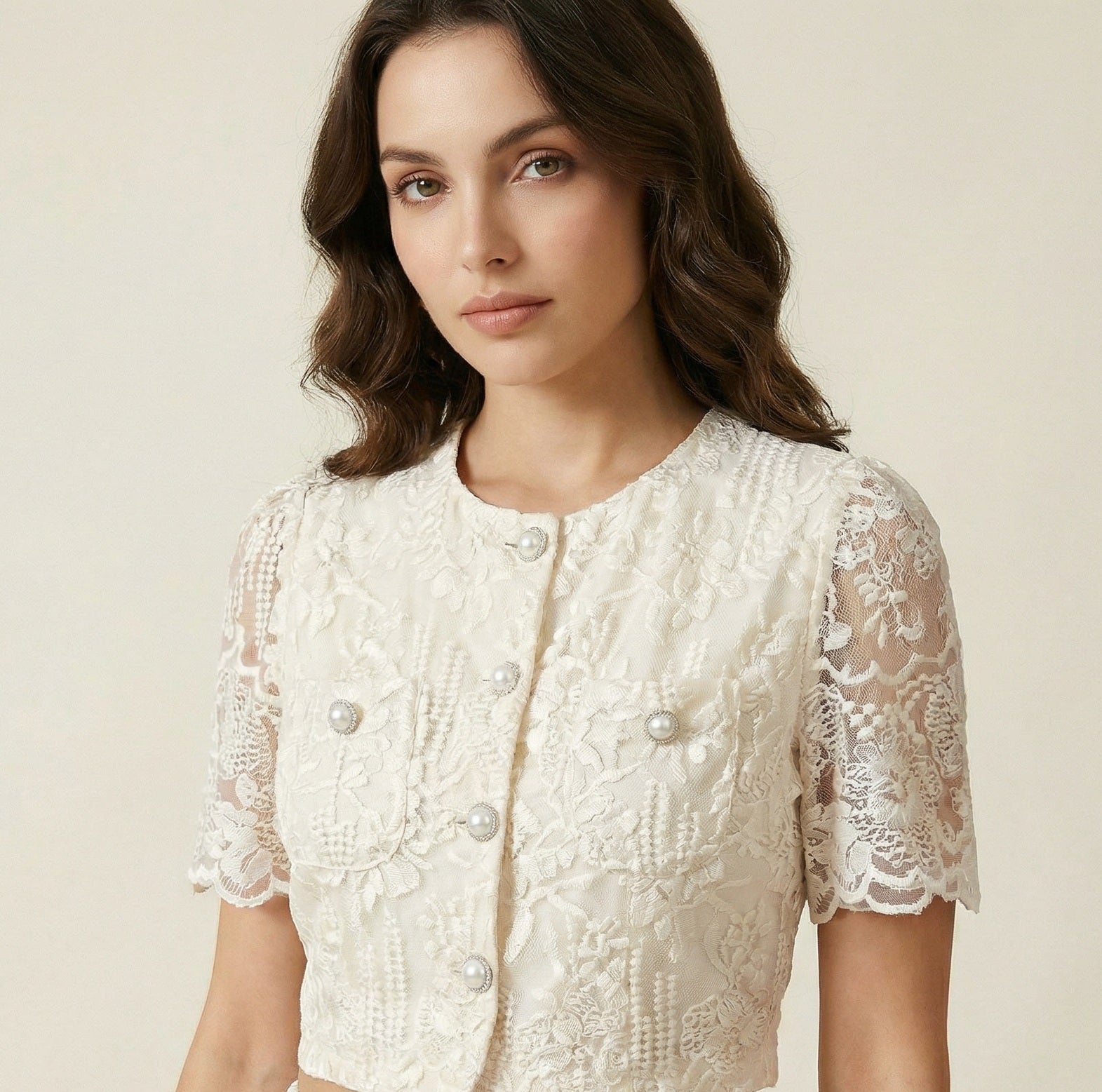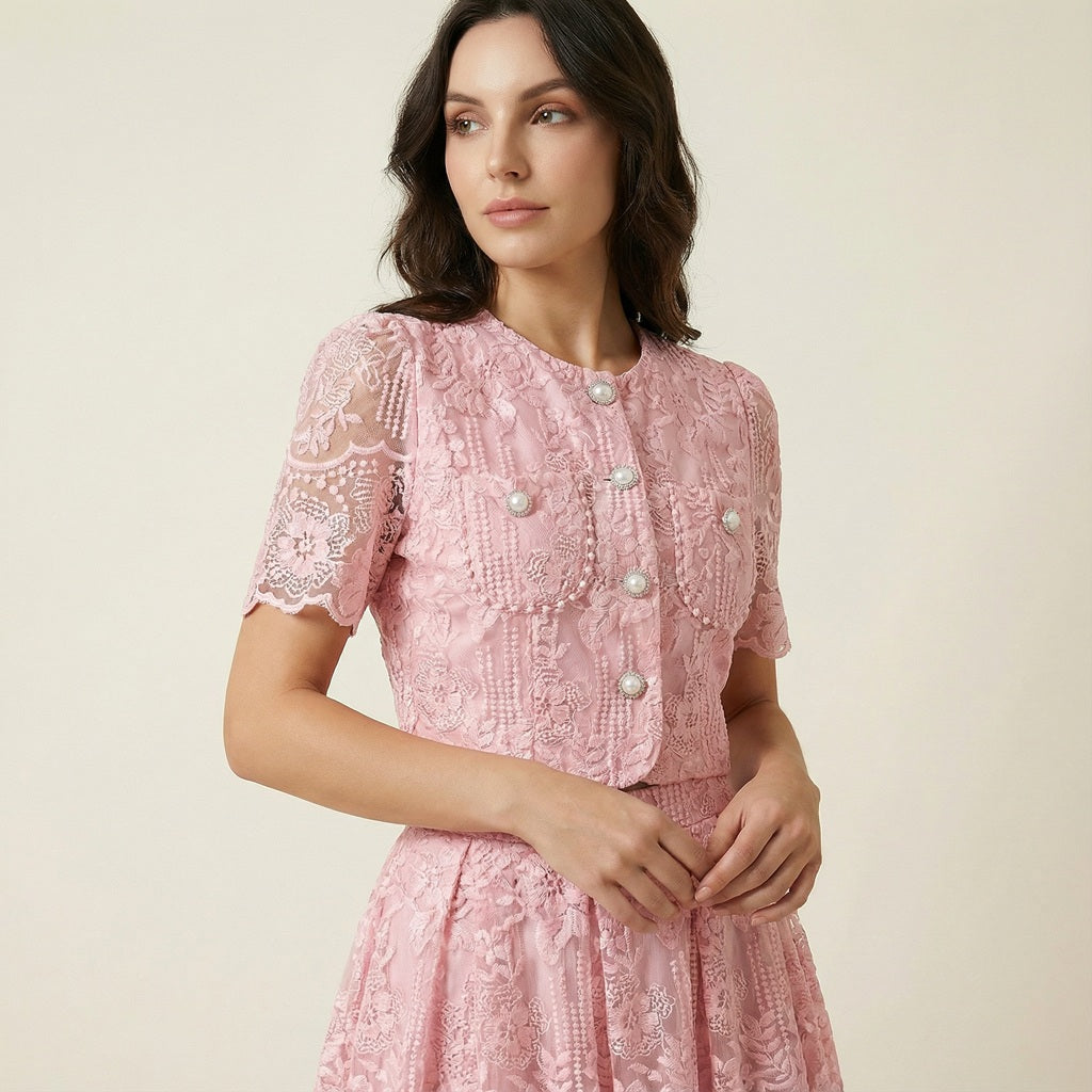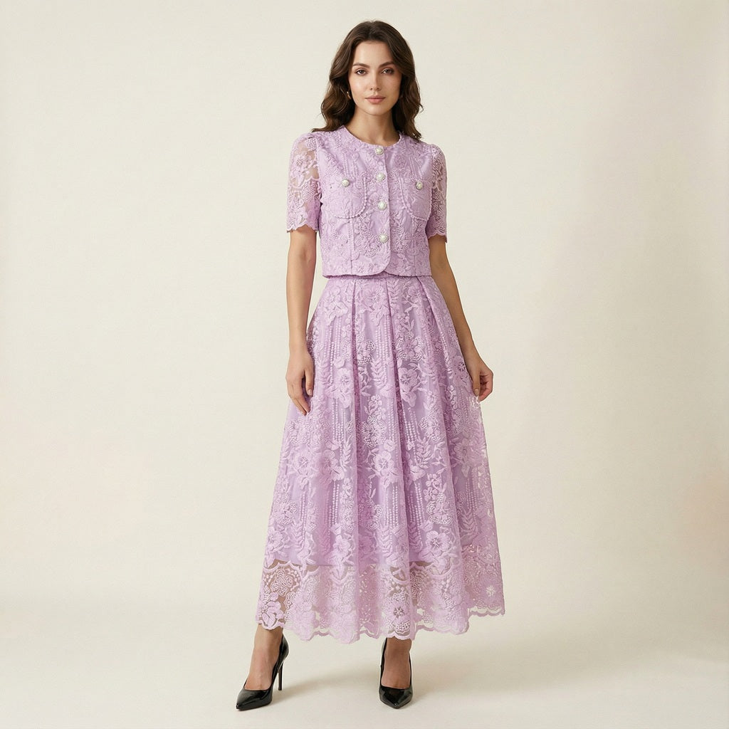 This coordinated set features a short-sleeved lace top detailed with delicate floral embroidery and vintage-inspired pearl buttons. The matching high-waisted midi skirt offers a graceful flow, finished with a scalloped lace hemline that adds a touch of romantic flair.