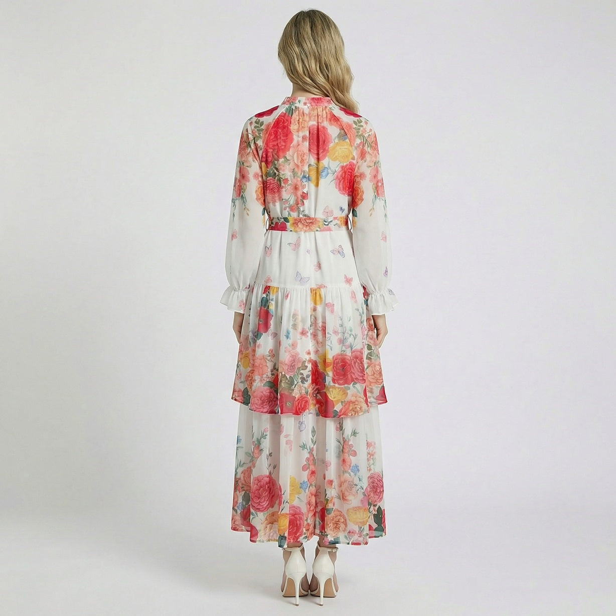 Experience the epitome of effortless elegance with our Tracy Maxi Dress. This stunning piece features a vibrant, oversized rose and butterfly print that breathes life into a lightweight, airy chiffon fabric. Designed with a sophisticated high-neck ruffle and a delicate button-down bodice, it transitions seamlessly from garden weddings to upscale brunch dates.