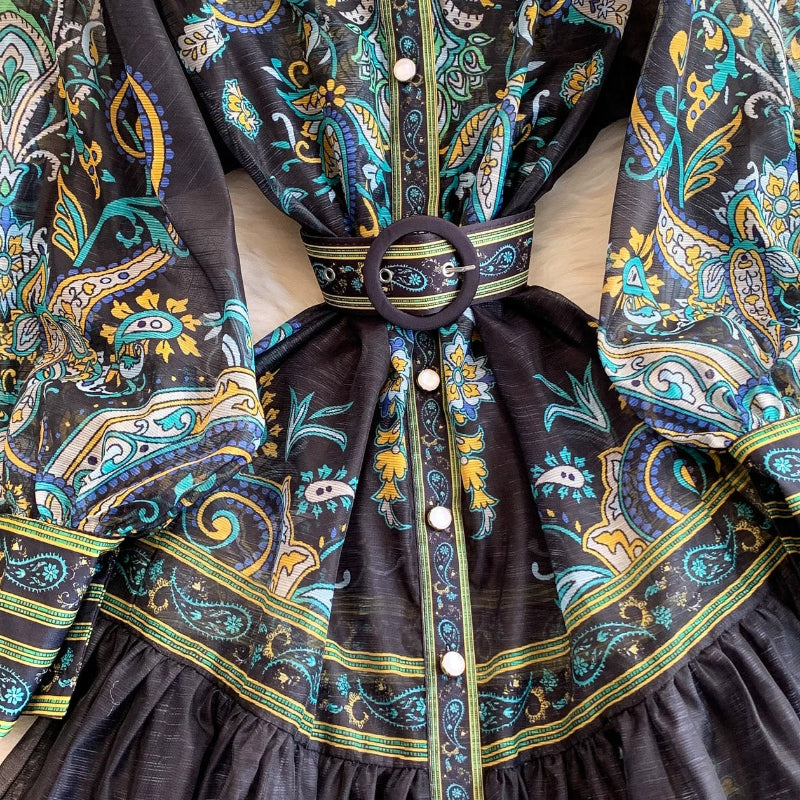 Elevate your wardrobe with the Valeria Maxi Dress, a masterpiece of vintage-inspired design and modern bohemian flair. This stunning floor-length gown features an intricate paisley tapestry print that demands attention. Crafted with a sophisticated high-neck collar and dramatic lantern sleeves, it strikes the perfect balance between modest elegance and high-fashion drama.