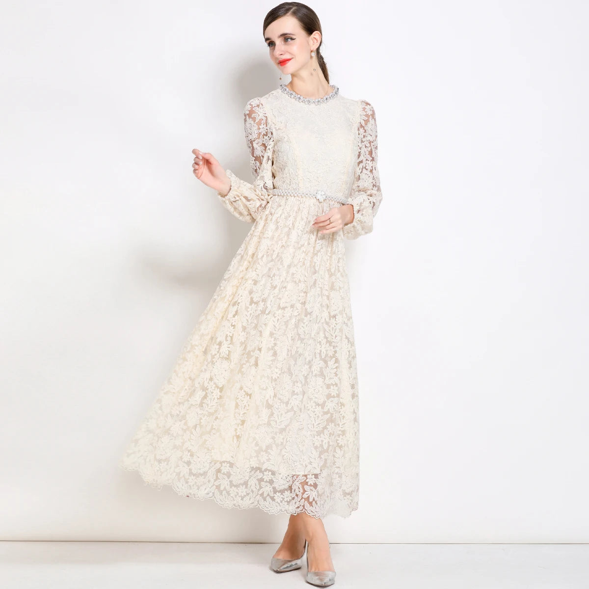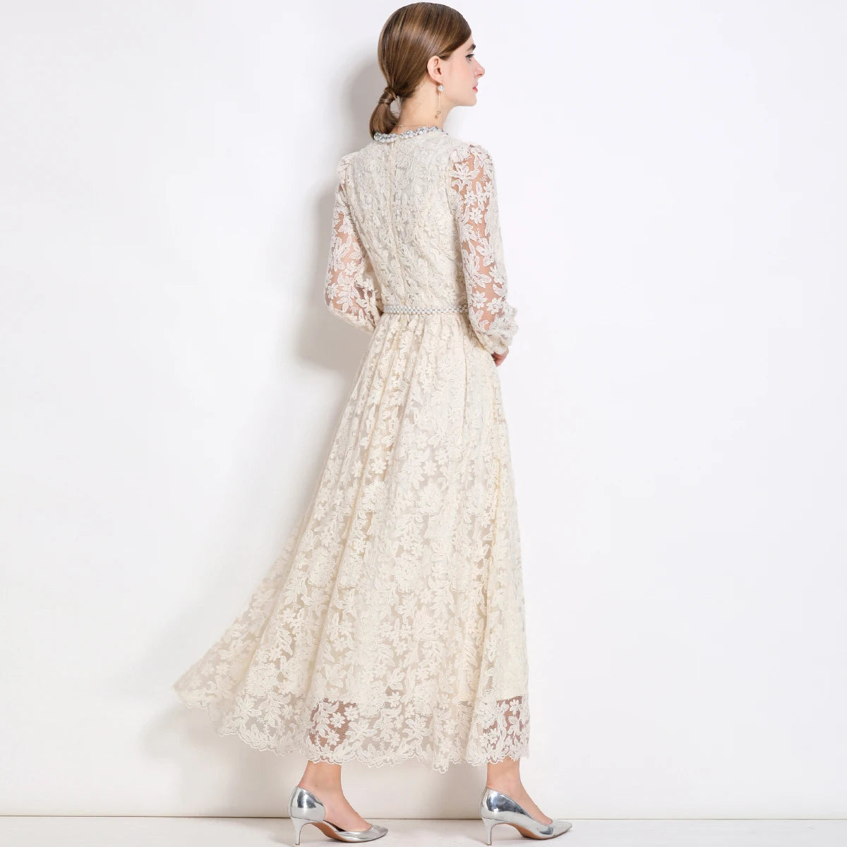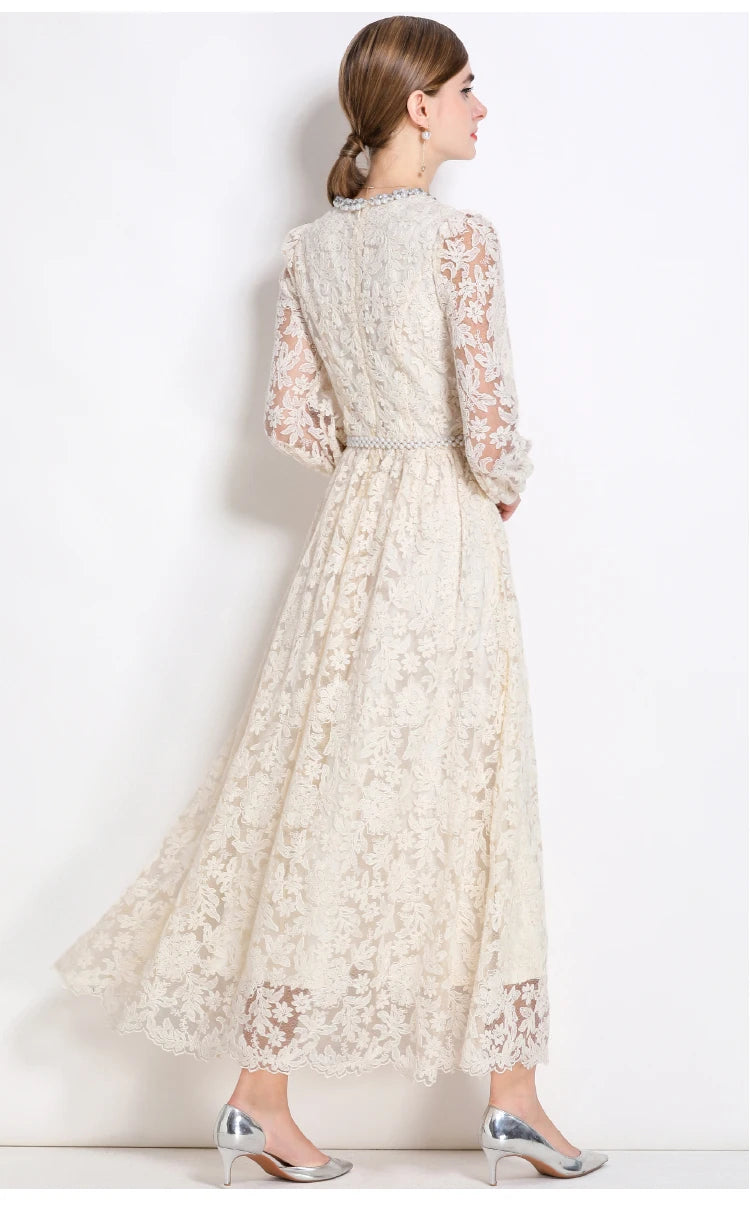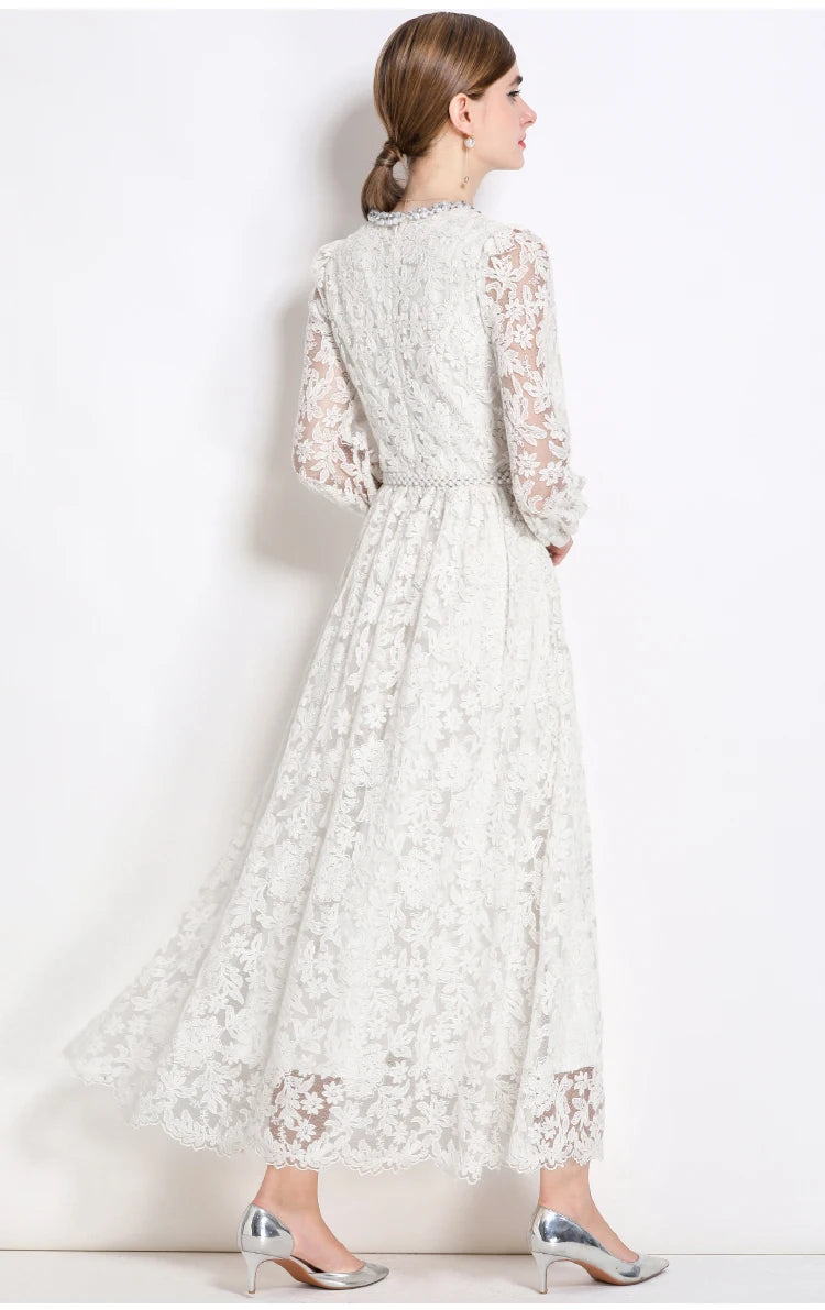 The Victoria Dress expertly combines elegance and artistry with its floral lace motif and delicate details. Featuring sheer mesh long sleeves and a collar neckline adorned with beads, this midi-to-almost-maxi length dress is refined and sophisticated. The elegant faux pearl belt accented with a floral detail completes the look. Available in apricot-beige, red-burgundy, and white, it offers versatile, timeless options for a polished, graceful style.