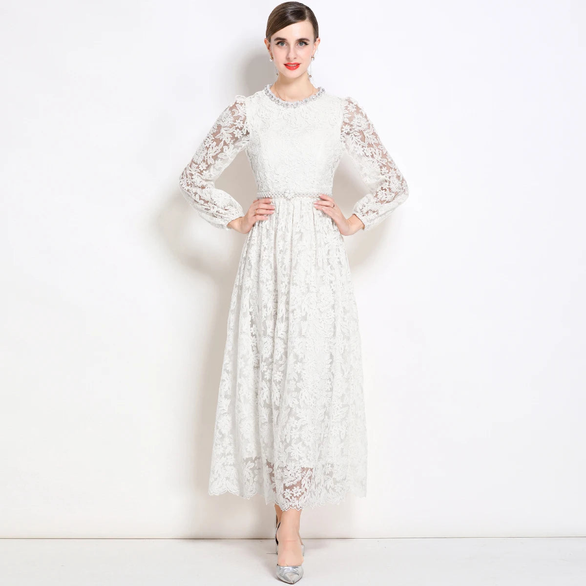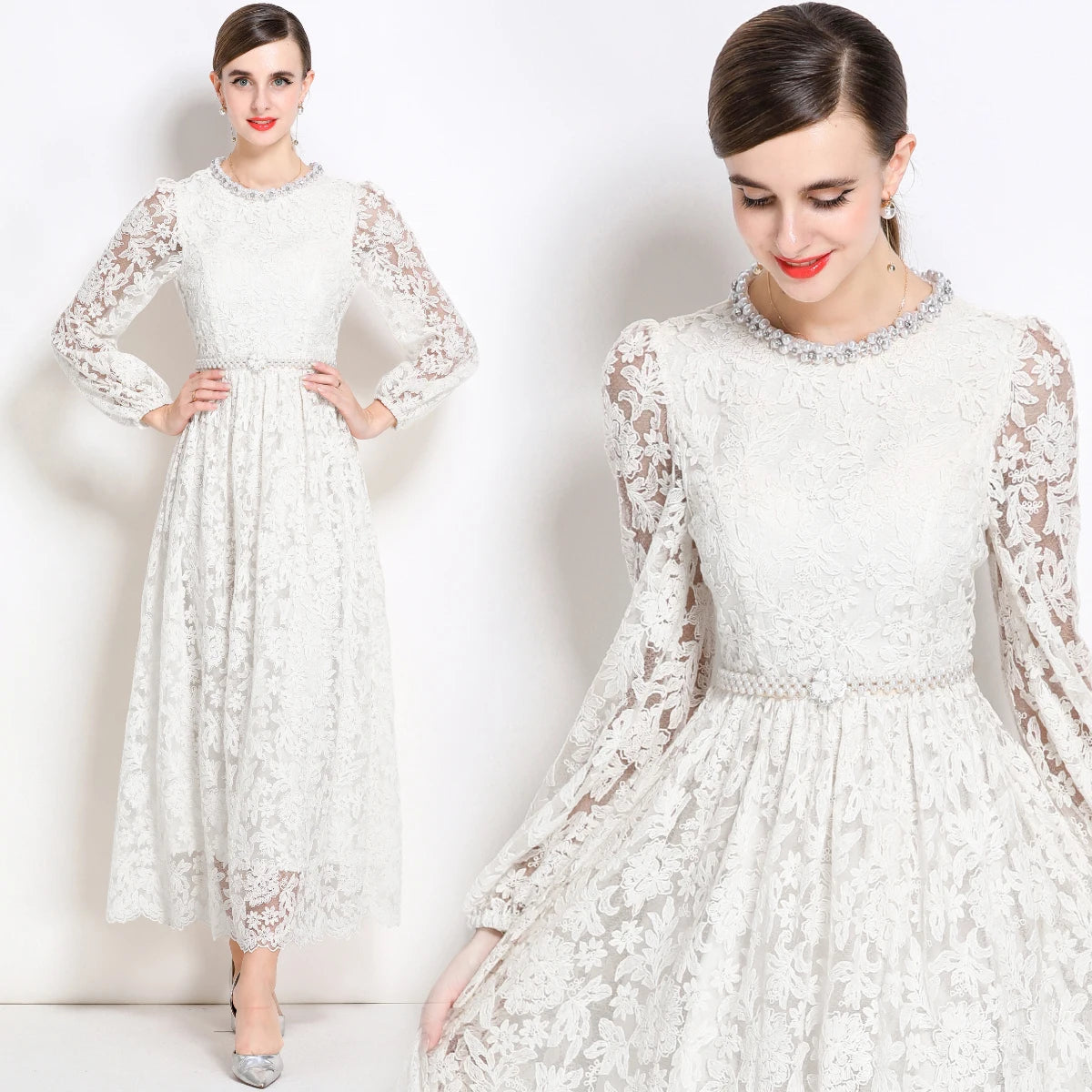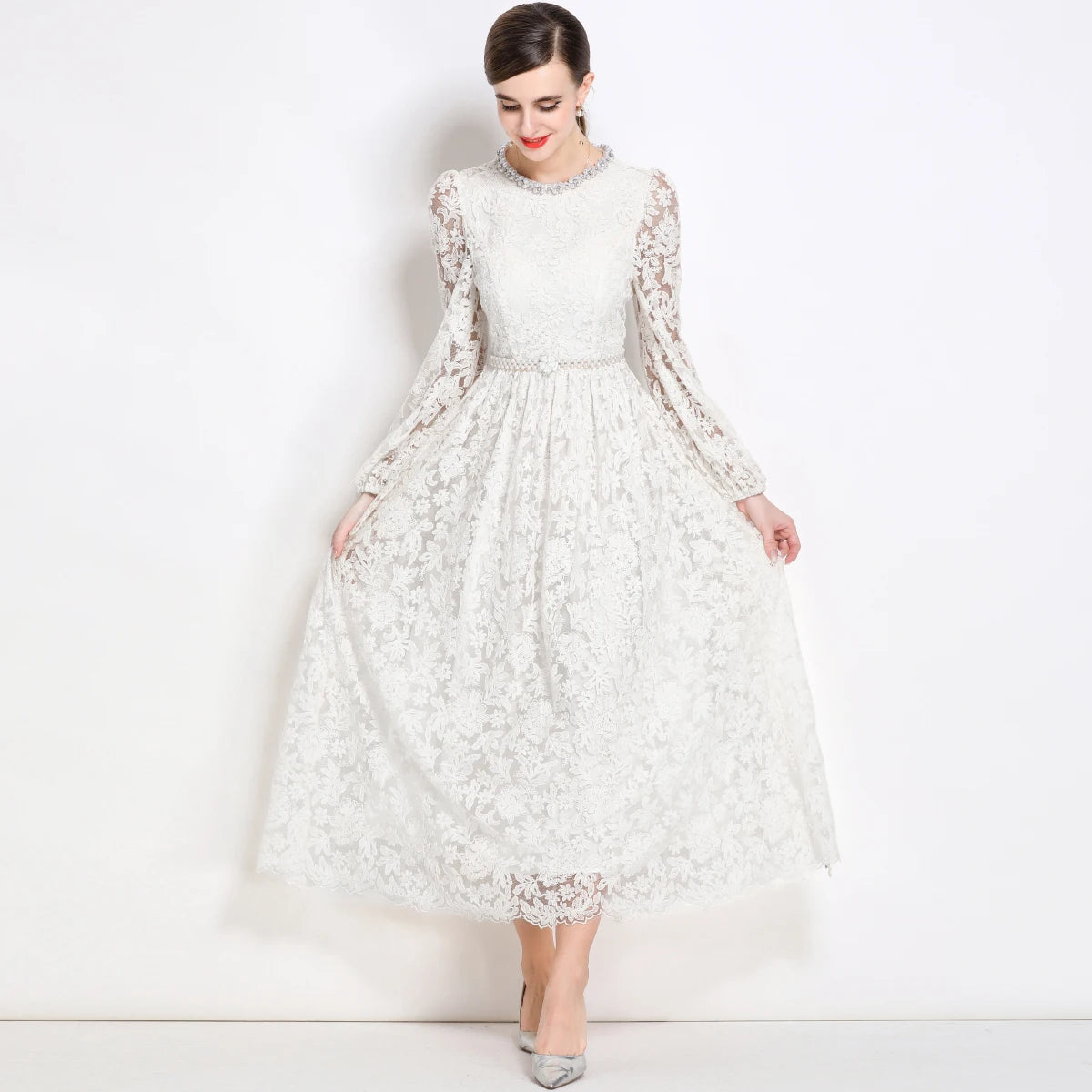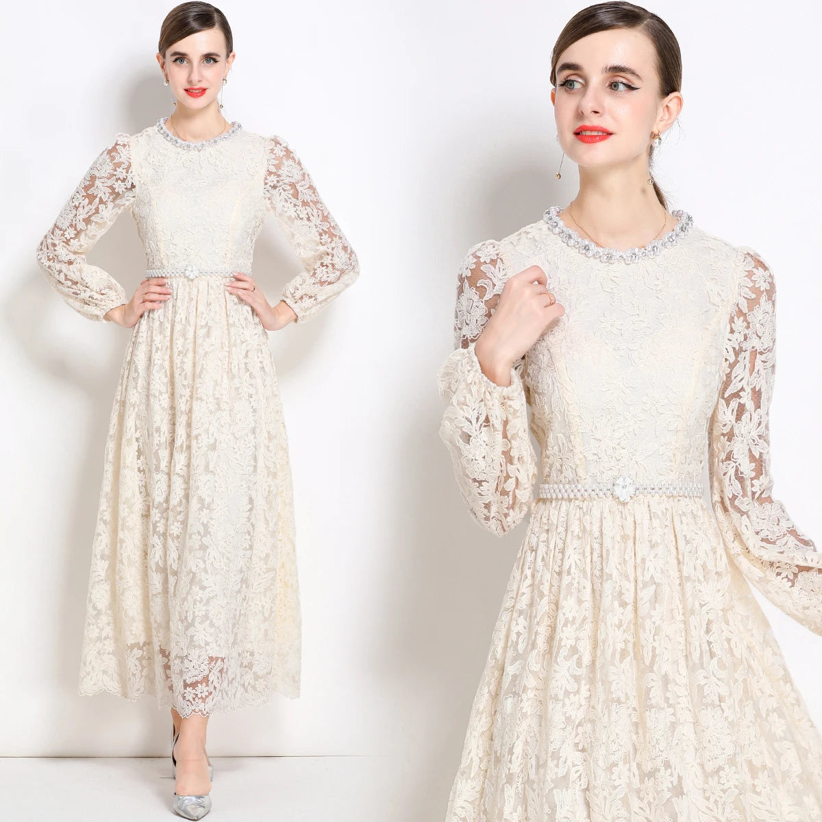 The Victoria Dress expertly combines elegance and artistry with its floral lace motif and delicate details. Featuring sheer mesh long sleeves and a collar neckline adorned with beads, this midi-to-almost-maxi length dress is refined and sophisticated. The elegant faux pearl belt accented with a floral detail completes the look. Available in apricot-beige, red-burgundy, and white, it offers versatile, timeless options for a polished, graceful style.