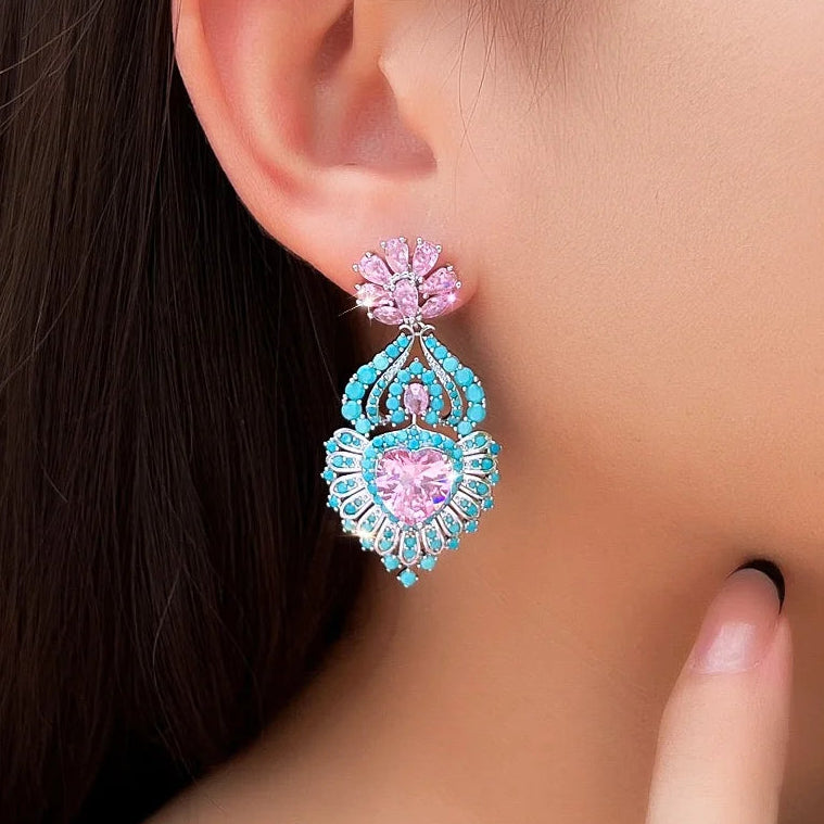 Zoe Earrings Pink and Blue Heart Chandelier Cubic Zirconia Earrings